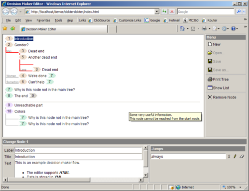 To accomplish this, dokterdokter offers information and advise through questionaires. A questionair is a list of questions, where new questions are presented depending on the answer to the previous question. Creating and maintaining complex questionaires calls for editors that are designed to do exactly this kind of job.