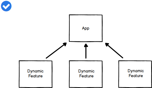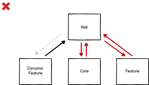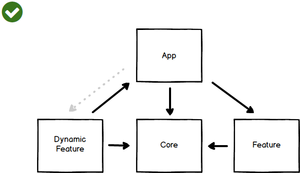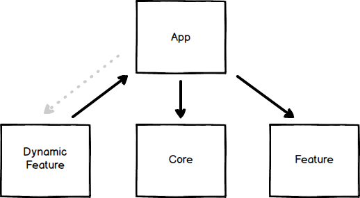 }As you can see in the graph, Core and Regular Feature module do not reference the App module. This enforces separation of concerns. However, this is not possible for the dynamic feature module: it must hard-reference App as a dependency.
