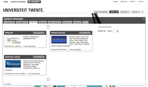 Op deze Shindig portal wordt content gepubliceerd in de vorm van gadgets. Dankzij de OpenSocial integratie hebben studenten van Universiteit Twente de mogelijkheid om, naast interne informatie, ook externe gadgets op te nemen. Bovendien kunnen gebruikers dankzij een Single Sign-On(SSO) integratie ook gepersonaliseerde content toevoegen. Zo kan er informatie worden opgevraagd uit de interne systemen van de UT, zoals lesroosters en cijfers. We zien de portal dan ook als een geweldig startpunt voor studenten en andere eindgebruikers.