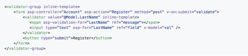 Microsoft has a guide on how to setup client-side validation using jQuery, jQuery validate and jQuery validate unobtrusive libraries. We were not very fond of including a second JavaScript framework into our website, since it introduces a lot of additional kilobytes to transfer and can introduce issues when accessing fields from our vue.js logic. For this reason, we’ve created a new library called “vue-dotnet-validator”, which is a very small vue.js library that supports validation attributes that is rendered using the Razor template engine.
