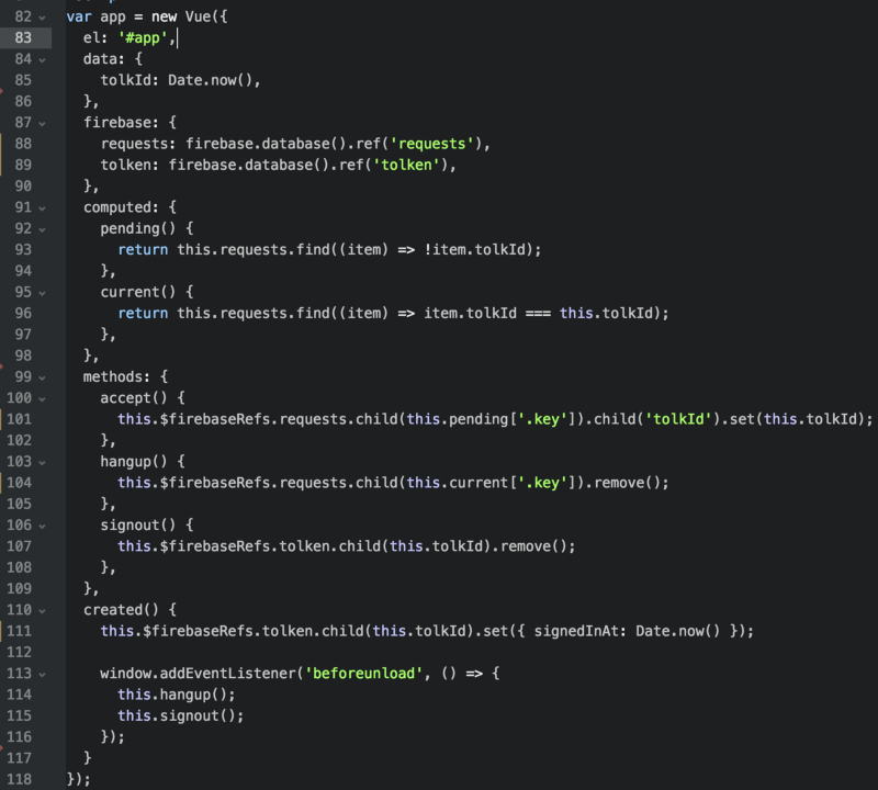 If you’re familiar with VueJS you’ll recognize most of the code. Vuefire adds the firebase attribute, where you declare the nodes in the firebase tree that you want to monitor. The content of these nodes are monitored and cached in an array, in this case this.requests and this.tolken. If you want to modify these nodes, you can use this.$firebaseRefs.