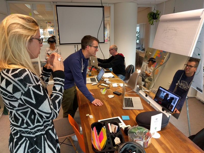 I joined the team of our accessibility expert Johan Huijkman. He wanted to build a product that helps deaf people have conversations with people that don’t know sign language. A noble cause, and fun tech because he wanted to use the Microsoft HoloLens to achieve this goal. The HoloLens would allow the deaf person to see a sign language interpreter as a hologram in the real world. The interpreter could be placed on screen in spot so that the deaf person could simultaneously watch their conversation partner and the interpreter. Also on the team were Thijs Suijten and Bas Peschier.