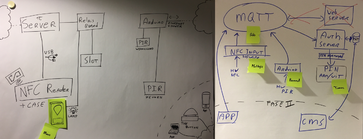 During the hackathon we brainstormed about a gazillion components that could open the door. During this brainstorm a few principles were defined that helped us create a secure system: