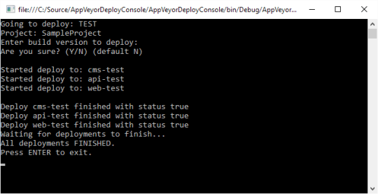 The AppVeyorDeployConsole needs only one thing as input: your AppVeyor API key. It then lets you create a deploy environment that contains multiple AppVeyor environments.