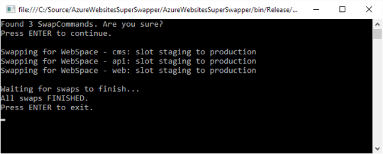 The Azure Websites Super Swapper only does one thing: swap websites. It takes a CSV file as input which contains a list of websites to swap. When you run this tool it will ask for confirmation and swap all the websites. You can see when the swap is finished or if there were problems.