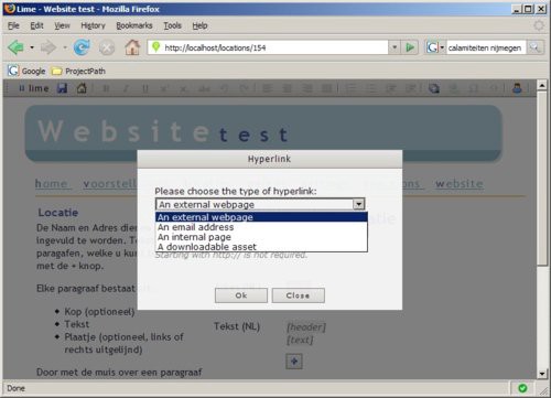 If your website is editable with Lime, you can simply surf to a specific lime url (often your website followed with ’/lime’) using your preferred browser like Firefox or Internet Explorer, and after logging in you get a small toolbar at the top of your page. With it you can create, delete and modify anything that has been made editable, ranging from fixing a typo, uploading images (which are scaled on the fly) to adding whole new database entries.