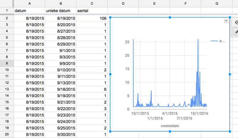 Stap 3: En als je die data vervolgens in Google Spreadsheets inlaadt en er een grafiek op loslaat van het aantal unieke aanmeldingen per datum, dan krijg je het volgende: