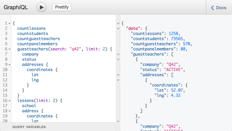 De uitkomst van een paar dagen programmeren is een GraphQL API die je kan bevragen op https://www.codeuur.nl/graphiql. Klink linksboven op de PLAY knop om de query in het linker scherm uit te voeren, en rechts het resultaat te zien.
