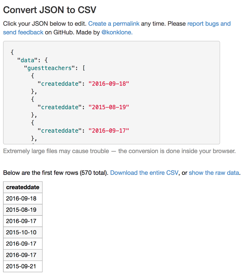 Stap 2: Kopieer het resultaat uit het rechter scherm, en plak die in https://konklone.io/json/ om het naar een spreadsheet formaat om te smurfen. Download vervolgens het CSV bestand.