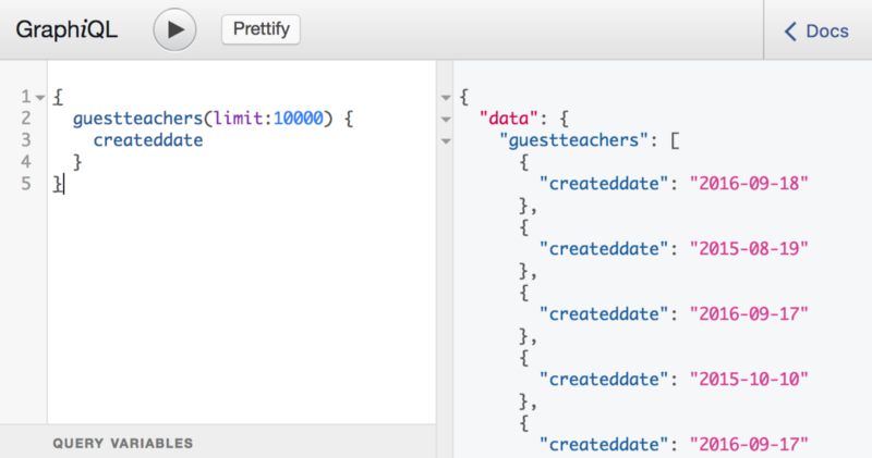 Of een grafiek van de createddate van gastdocenten, zodat je ziet wanneer er veel nieuwe gastdocenten bij zijn gekomen. Die is trouwens best wel makkelijk.