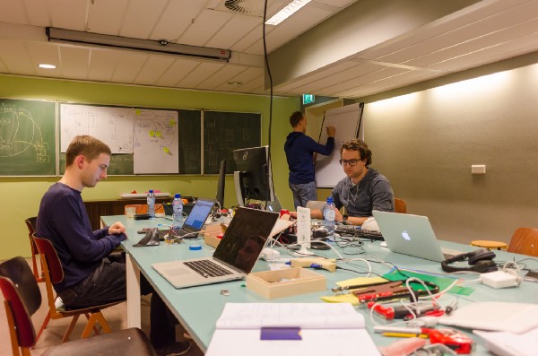 THE DOOR — Volg het spoor van vernielingen en je komt bij het team van The Door. Op de balie liggen kapotte telefoons, snoeren, een Arduino en ook een Raspberry Pi. De dag begon bij dit team met het opstellen van een heus plan en dat hebben ze tien hele minuten volgehouden. Nu gaat het volgens de filosofie: het gaat zoals het gaat. De lat ligt niet al te hoog: het is al tof als met een computer de voordeur geopend kan worden.