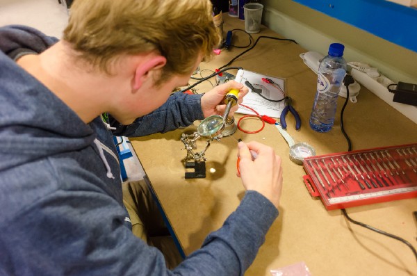 De eerste twaalf uur zitten erop! En die zijn redelijk vol verwachting verlopen. Iedereen begint optimistisch, vol goede moed en ziet alleen maar lege uren voor zich. Tijd zat dus. En dan worden de koontjes wat roder, er klinkt zo nu en dan wat gevloek en getier en dan vindt iedereen de modus. Het soldeerapparaat schroeit, er wordt gezaagd, Lego-blokjes vallen. Dit is dus w00tcamp!