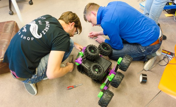 GROUNDHAWQ — De wielen, er is iets met de wielen. Het buzzte al rond. Te veel wrijving zorgt ervoor dat de GroundHawQ niet lekker door de bocht gaat. De oplossing: de 3d-printer aanslingeren. Alleen die doet 14 uur over een wiel en morgen moet er natuurlijk wel een prototype staan. Dan maar met een wat simpelere versie. Wat wel extreem vet is: de gunshotdectoren werken. Deze herkent het geluid van een geweer en kan bepalen uit welke richting het komt. Handig om straks stropers mee op te sporen.