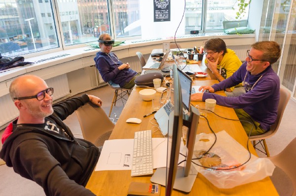 EYECATCH — Een korte samenvatting van de dag: 9:15 uur Hoogtepunt van de dag, om de beurt de hololens op, dat is lachen, 11:00 uur De eerste huilbui, het hele idee is toch een stuk moeilijker dan vooraf gedacht, 12:00 uur De teamleden rapen zichzelf bij elkaar (teameffort), 12:45 uur Nieuw idee: terug naar de basis = skypen met een tolk.