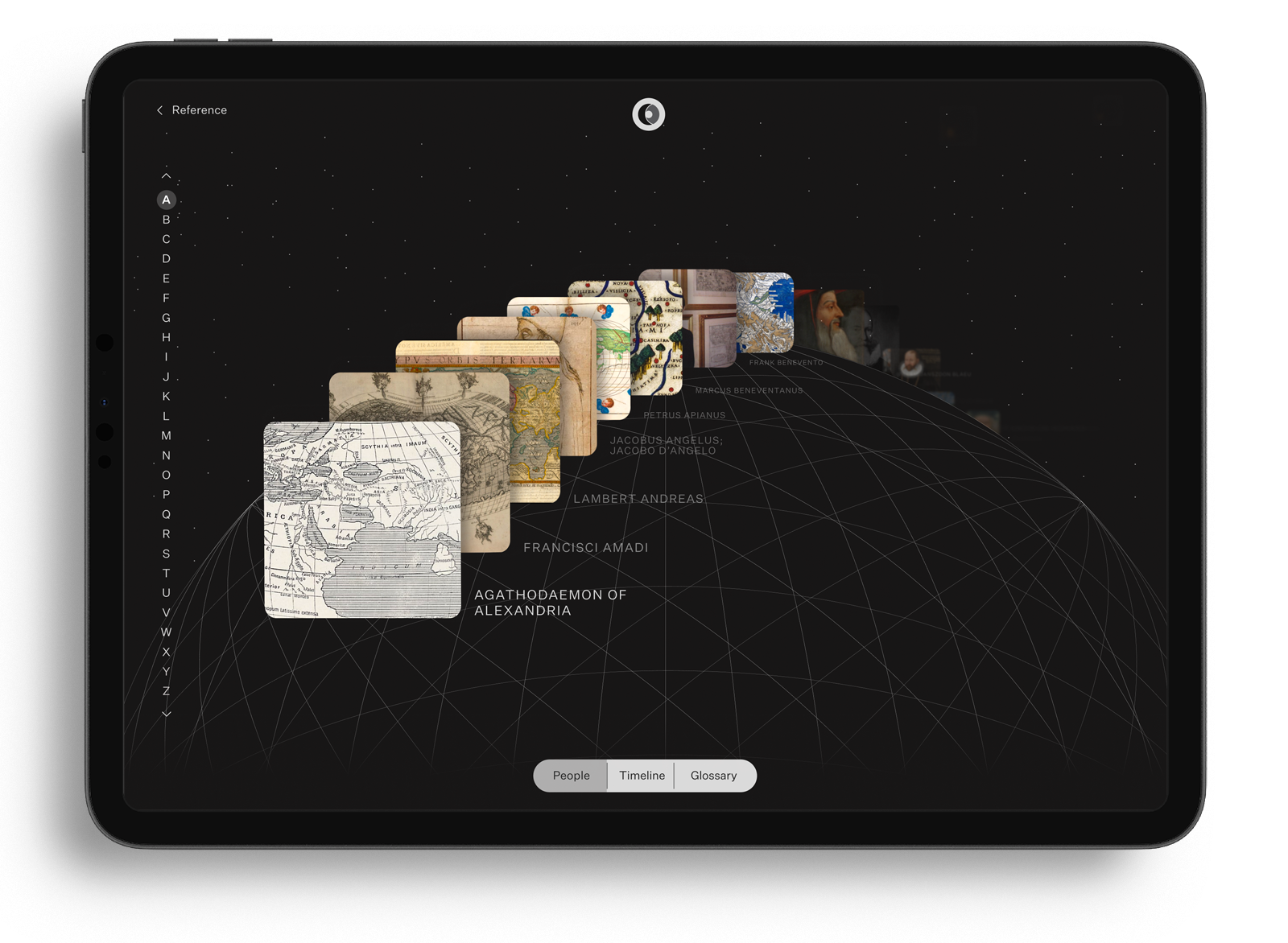 Daarom hebben we ervoor gezorgd, dat een bezoeker na de gallery of spaces op de referencespagina een 3D-wereldbol te zien krijgt. Om het 3D-effect te vergroten hebben we de lemma’s als kaarten in de ruimte laten zweven boven die wereldbol. Als de bezoeker scrollt, bewegen de kaarten langs die bol op hem af. Net zoals andere onderdelen van Oculi Mundi, was het soepel krijgen van deze animatie een flinke uitdaging.