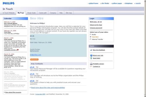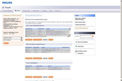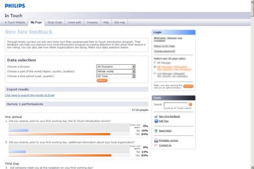 Q42 has gone to quite some extent in order to make integration with existing new-hire systems as easy as possible. New employees in North America are entered in an HR-database using PeopleSoft, which automatically exports their information to In Touch through a secured connection. This export will automatically start the In Touch programs for these new hires, and their managers will receive email reminders in time to be able to make arrangements. Also, In Touch is able to retrieve user information from Philips’ internal Diamond user directory, to ensure correct user information at all time.