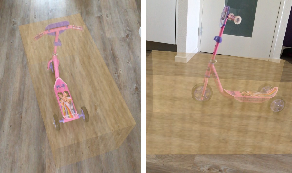 Eigenlijk had je in de linkerfoto al willen zien, dat het stuur van de step boven het pakket uitsteekt. Het probleem hier was dat ‘occlusion’ op dit moment nog niet werkt in AR. Occlusion betekent dat objecten in de fysieke wereld (deels) óver objecten in de virtuele wereld kunnen liggen. Hiervoor moet eigenlijk een 3D-model in kaart gebracht worden van alle objecten en mensen in de ruimte. Dit werkt helaas nog niet met Apples ARKit. Je kunt alleen horizontale en verticale vlakken detecteren.