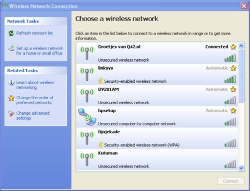 Hoe werkt het? Spoed je met je laptop en gezwinde haast naar het station. Kies aldaar in Windows ‘View Available Wireless Networks’, en er verschijnt iets in beeld als hiernaast. Klik op ‘Groetjes van Q42.nl’ en je bent online. Net als treinreiziger Rick, die ons op vrijdag 29 september om 17:18 uur mailde: ‘Groetjes terug en hartelijk dank voor ’t gratis internet’.