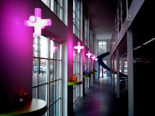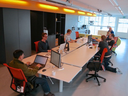 Het kantoor is ontworpen en verbouwd door D+Z, het architecten en projectmanagersbureau dat onder andere ook voor Apple Nederland, Lost Boys en McAfee gewerkt heeft. Zij noemden ons, om het netjes te houden, in het traject ‘zeer betrokken’. Het resultaat is een pand dat echt des Q’s is, dus waar we goed lol kunnen trappen, maar waar we tegelijk ook keihard kunnen werken. We hebben ruime werkplekken, met akoestisch dempend materiaal zodat zelfs Chris hardop mag praten. We hebben verplaatsbare Scrum-wanden en natuurlijk een uitgebreide games-hoek. Er zijn verschillende plekken waar je even rustig kunt zitten en mooie vergaderruimtes. ‘s Avonds wordt het kantoor kleurig verlicht door een reeks geprogrammeerde Philips Hue-lampen. Uitsmijter is een heuse glijbaan, die de vide met de benedenverdieping verbindt. Q’ers waren al bereid weekenddienst te draaien om een glijbaan bij elkaar te verdienen. Toen Google ons tijdens een recent bezoek uitdaagde met het feit dat zij een glijbaan hebben konden we zeker niet meer terug. Dus die zit er in.