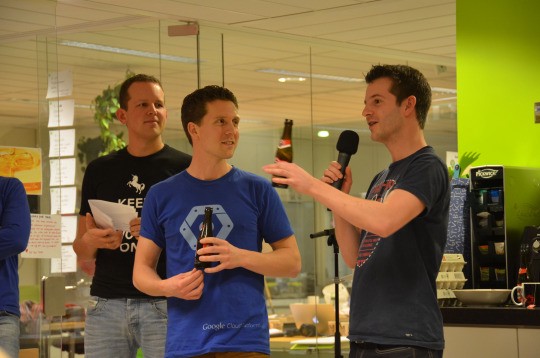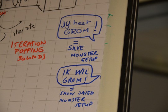 Laurens, Richard en Jimmy; Jeroen van Oak & Morrow; Boaz van Elasticsearch en Diane van Lucky Kat Studios hadden een supervet idee wat ook nog haalbaar was: een monster die je kunt beschrijven, naar je luistert en dan direct precies zo geprojecteerd wordt door de beamer. Dat is pas gaaf spannende verhalen vertellen.